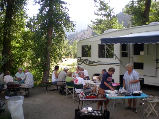 We stayed at the Elks Flat campground in Pine. Activities included four-wheeling, fishing, bathing in the hot spring, and of course there were games. The Copes invited us to their house for a BBQ and more games.