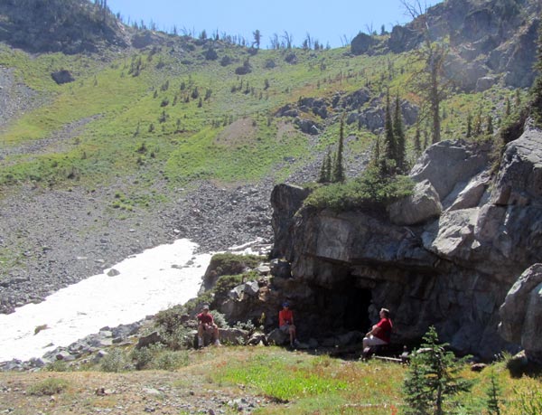 The guys drove up to Black Lake one day, then hiked up to the old mine. Charlie paused by a big rock to wave at the camera.