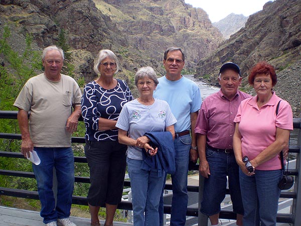 Sherm, Judy, Linda, Charlie, Gary and Sherry standing at the viewpoint looking down the Snake River below the Hells Canyon Dam.