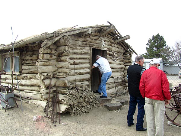 Eldon checks out the pioneer cabin while Dwight and Larry speculate about a piece of farm equipment.