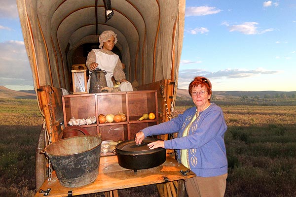 Sherry helped one of the pioneers cook dinner on the old Oregon Trail.